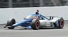 Palou was signed by Chip Ganassi Racing to drive the No. 10 Honda for the 2021 IndyCar Series season.[19] On 18 April 2021, Palou earned his maiden IndyCar Series victory in the season-opening race at Barber Motorsports Park. Palou started on pole for the first time in his IndyCar career at the first race of the season at Texas Motor Speedway, although his pole position was earned due to his early-season championship point lead after qualifying was canceled for the race due to inclement weather.[20] Palou added another podium for the season at the GMR Grand Prix and then finished second in the 2021 Indianapolis 500 to Hélio Castroneves' record-tying fourth victory. Palou's finish in the 500 vaulted him into the points lead for the championship. For the rest of the season, only himself and Pato O'Ward would hold the points lead.