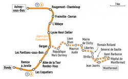 The line then runs along Pasteur Boulevard, where it makes a stop at Les Pavillons-sous-Bois before making its way north. After it reaches Gargan Station, which is located between Louis-Pasteur and Roy Boulevards, it travels up the former RN3 overpass, now known as Aristide-Briand Avenue, before returning to ground level again. The train then runs between Édouard-Vaillant and Maurice-Berteaux Boulevards. A bit further, the line stops at the Lycée Henri Sellier Station, then the old L'Abbaye Station before following an S-shaped route westward. It then stops at Freinville-Sevran Station, runs along the former RN370, which is now called Westinghouse Boulevard, before crossing the de l'Ourcq Canal. From this point on, the train heads directly westward. It makes a stop at Rougemont-Chanteloup Station then reaches the La Plaine à Hirson line near the bifurcation at Roissy and runs along it for a few hundred metres. The train completes its journey at Aulnay-sous-Bois Station on two dead-end tracks 7,900 metres (25,900 ft) from the line's starting point.