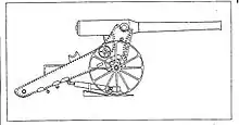 The gun was placed on a wooden platform, consisting of three layers of beams (deals) each measuring 7,5 cm by 7,5 cm by 4,5 m. The size of the platform was 4,5 m by 4,5 m by 22,5 cm. The layers were placed at right angles to one another. The platform weighed 5,200 kg. The platform had to be placed level in all directions to ensure that the range did not change when the gun pointed in a different direction.[1]: p. 165 Near the "front" of the platform a pivot plate was securely attached to the platform. Recoil was controlled by a hydraulic cylinder which connected the trail to the pivot plate. Chocks were also placed behind the wheels to limit recoil.[1]: p. 164