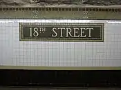 The 18th Street station is a local station on the IRT Broadway–Seventh Avenue Line of the New York City Subway. Located at the intersection of 18th Street and Seventh Avenue in Manhattan, it is served by the 1 train at all times and by the 2 train during late nights.