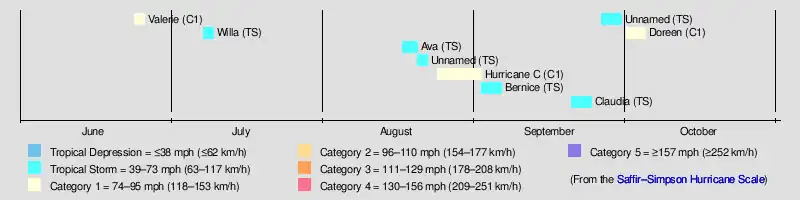 Later in the month, another storm similar to Bernice existed. Tropical Storm Claudia formed on September 20 to the southwest of Acapulco. It maintained a general northwest movement for its duration. On September 23, Claudia crossed over the western portion of the Baja California peninsula, moved over water, and again struck the peninsula before dissipating.[3]