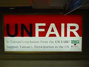 - ↑ "PRC Taiwan Affairs Office (2007-09-24): Top adviser slams at Taiwan leader's UN "referendum" bid". Gwytb.gov.cn:8088. 2007-09-24. Retrieved 2011-01-02.
