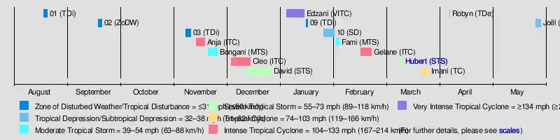 It was predicted by the Mauritius Meteorological service that there would be between nine and eleven named storms in the South West Indian Ocean during the season.[2] Their further assessment that there was a good probability of a named storm forming in November was justified when Tropical Cyclone Anja formed on November 14.