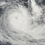 Convective banding substantially increased on March 13, allowing Tomas to become the fourth severe tropical cyclone of the season early the next morning.[25] Around the same time, the JTWC assessed the storm to have attained winds of 155 km/h (95 mph), ranking it as a Category 2 cyclone.[24] By the afternoon of March 14, Tomas had developed a banding-eye feature surrounded by deep convection. At this point, the FMS assessed the storm to have winds of 150 km/h (95 mph) and a pressure of 950 hPa (mbar).[26] The JTWC also noted further intensification, upgrading Tomas to a Category 3 equivalent storm.[24] Tomas intensified on the night of March 14 and became a Category 4 severe tropical cyclone(according to the Fiji Meteorological Service) with winds up to 170 km/h and gusts up to 215 km/h blowing roofs off some houses and damaging buildings around the eastern side of Vanua Levu.