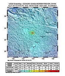 The earthquake struck at 21:19:46 China Standard Time (CST, UTC+8) on 8 August 2017 in Zhangzha Town in Jiuzhaigou County (33°12′N 103°49′E / 33.20°N 103.82°E) with magnitude 7.0.[lower-alpha 1][lower-alpha 2][8] Cities as far away as Lanzhou, Chengdu and Xi'an felt the quake.[9] The epicenter was 39 kilometres from the county seat of Jiuzhaigou County, 66 kilometres from Songpan County, 83 kilometres from Zhouqu County, 90 kilometres from Zoigê County, 105 kilometres from Longnan City, and 285 kilometres from Chengdu City.[10]