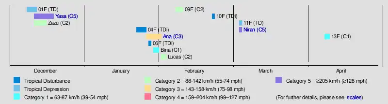 The season began with the formation of Tropical Depression 01F, over a month after the official start. Despite the slightly late start, activity picked up, with two more systems forming after. In mid-December, Severe Tropical Cyclone Yasa became the earliest category 5 severe tropical cyclone on record in the South Pacific basin. Yasa struck Fiji, resulting in heavy damage. Severe Tropical Cyclone Ana and Tropical Cyclone Bina also affected Fiji within days of each other, resulting in heavy rains and strong winds. Tropical Cyclone Lucas crossed into the basin from the Australian region and affected the Loyalty Islands. In early March, Cyclone Niran moved into basin from the Australian region as a Category 5 severe tropical cyclone. The storm passed close to New Caledonia, bringing heavy impact, before transitioning into an extratropical cyclone north of New Zealand.