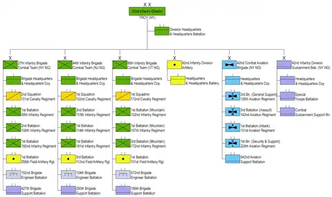 The division headquarters is a unit of the New York Army National Guard. The division currently includes Army National Guard units from fourteen different states, including Connecticut, Maine, Maryland, Massachusetts, New Hampshire, New Jersey, New York, Rhode Island, and Vermont. As of 2007, 67 percent of 42ID soldiers are located in New York and New Jersey.[2]