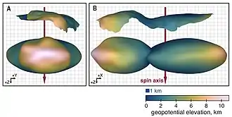 Shape model of Arrokoth, colored to show variations in geopotential elevation across its surface[13]