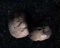 486958 Arrokoth (provisional designation 2014 MU69; formerly nicknamed Ultima Thule[lower-alpha 2]) is a trans-Neptunian object located in the Kuiper belt. Arrokoth became the farthest and most primitive object in the Solar System visited by a spacecraft when the NASA space probe New Horizons conducted a flyby on 1 January 2019.[20][21][22] Arrokoth is a contact binary 36 km (22 mi) long, composed of two planetesimals 21 and 15 km (13 and 9 mi) across, that are joined along their major axes. With an orbital period of about 298 years and a low orbital inclination and eccentricity, Arrokoth is classified as a cold classical Kuiper belt object.