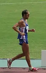 Men's racewalk. Walker at right appears to be illegal in that both feet are off the ground, but an infraction is only committed when loss of contact is visible to the human eye.[1]