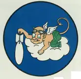 - ↑ Approved 3 July 1943. Description: On a medium blue disc, border black, a devilish cherub, face arms, body, and barbed tail flesh colored, wings white, tongue and finger nails red, eyes and horns green, wearing leaf trousers yellow-green and aviator's goggles brown, leaning over edge of white cloud formation and dropping a gray aerial bomb, point to base with right hand.