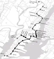 1. 1 2 3 4 5 6 "Passaic Bergen Hudson Transit Project". Projects & Reports. NJ Transit. Retrieved June 22, 2020. One alignment would connect to the proposed Northern Branch extension of HBLRTS near 83rd Street. From there, the service would operate on or parallel to the proposed HBLRTS Northern Branch tracks to connect at Tonnelle Avenue, the existing northernmost terminus of HBLRTS. A potential station stop at 69th Street would support cross-transfer among the two lines and provide passenger access to the surrounding commercial district. The other alignment would branch off to use the former Edgewater Branch and connect to the proposed Northern Branch extension of HBLRTS just north of the proposed 91st Street station.