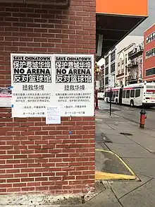 "Save Chinatown No Arena" posters opposing the proposed arena