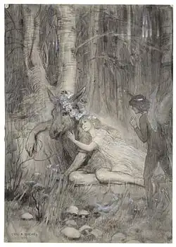 A drawing of Puck, Titania and Bottom in A Midsummer Night's Dream from Act III, Scene II by Charles Buchel, 1905