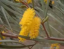 Acacia Mill. sect. Juliflorae Benth., commonly referred to as mulga includes A. brachystachya.[9] Most Acacias have been studied comprehensively, however many mulgas have not.[9] It has been concluded that it is likely that mulga plants are insect pollinated as this is often the case with arid zone Acacias.[9] Although it generally flowers in April–August, A. brachystachya does flower irregularly depending on weather and climatic conditions.[3] These flowers are hermaphroditic and grow after heavy rainfall at any time of year.[9] Despite the potential year round flowering, reproduction does not always follow. Mature pods are usually only developed when summer rain is the cause of flowering followed by rain in the subsequent winter.[9] Because A. brachystachya is most easily distinguished from similar species by assessing the pods, it can be difficult to correctly identify without having experiencing the appropriate climatic conditions.[9]