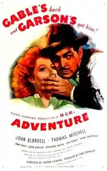Adventure is a 1946 American romantic drama film directed by Victor Fleming and starring Clark Gable and Greer Garson. Based on the 1937 novel The Anointed by Clyde Brion Davis, the film is about a sailor who falls in love with a librarian. Adventure was Gable's first postwar film and the tagline repeated in the movie's famous trailer was "Gable's back and Garson's got him!" Gable had suggested "He put the arson in Garson," while Garson proposed "She put the able in Gable."