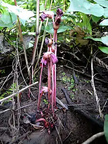 Aeginetia indica, commonly known as Indian broomrape[1] or forest ghost flower, is a holoparasitic herb or root parasite of the plant family Orobanchaceae. It grows in moist deciduous and semi-evergreen forests of tropical and subtropical Asia and New Guinea.[2][3][4] It parasitises plants of the families Cannaceae, Commelinaceae, Cyperaceae, Juncaceae, Poaceae, and Zingiberaceae.[5]