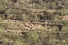 Trincheras served a number of purposes such as defense, homesites, and agriculture.[14] Their agricultural purposes were to provide farmers a level planting surface and aid in preventing erosion, collecting and managing water, and preventing frost damage.[15] Hillside agriculture in the small fields created by trincheras was often of secondary importance to floodplain farming. Trinchera agriculture was probably used to grow all crops. Southwestern Indian farmers often cultivated several different fields and crops in different locations and environments to reduce the risk of crop failure. Should one or more plantings fail for whatever reason, other plantings might succeed.