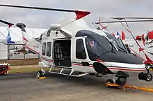 The AgustaWestland AW169[1] is a twin-engine, 10-seat, 4.8t helicopter developed and manufactured by the helicopter division of Leonardo (formerly AgustaWestland, merged into Finmeccanica since 2016).[2] It was designed to share similarities with the larger AgustaWestland AW139 and AgustaWestland AW189.