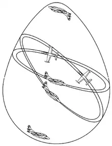 The turning battle of a dogfight can be executed in an infinite number of geometric planes. Pilots are encouraged to keep their manoeuvres out of the strictly vertical and horizontal planes, but to instead use the limitless number of oblique planes, which is much harder for an adversary to track. This infinite number of planes around a fixed point about which the aircraft turns is termed the "post and bubble". A fighter that can maintain position between an aircraft and its imaginary post cannot be attacked by that aircraft.[7] The imaginary bubble, however, is misshapen by gravity, causing turns to be much tighter and slower at the top, and wider and faster at the bottom, and is sometimes referred to as a "tactical egg".[7]