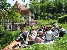 Although the work of the Akademie Waldschlösschen has not been limited to gays and lesbians as target groups, it was primarily founded as a "gay adult education center", which reflects its origins in the German gay movement of the 1970s. Since then it has developed into a national center for networking among and training of activist LGBT*I* workers (e.g., of teachers, lawyers, clergy, gay fathers, and gay, gaylesbian, and queer university student groups, many in cooperation with Trans*Aktiv and Intersexuelle Menschen e.V.). The history of the German gay movement is unimaginable without the Waldschlösschen.[1] Ralf König has mentioned it several times in his books, for example, as the setting of Beach Boys (Rowohlt 1989, ISBN 3499134578).