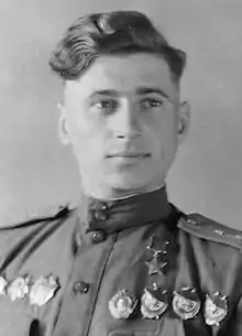Soon arriving at the warfront in March 1943 as a pilot in the 15th Guards Assault Aviation Regiment he rose up through the ranks and became close friends with Vladimir Aleksenko, another future twice Hero of the Soviet Union. By the time he was nominated for his first gold star on 11 November 1944 he had reached to position of deputy squadron commander and totaled 180 sorties. Later on during the battle for East Prussia he sometimes flew 3-4 sorties in a day, and during the entire operation not a single squadron member under his command was killed in action. On victory day he was nominated for a second gold star; during the war he flew in the battles for Leningrad, Königsberg, Novgorod, Tallinn, Vyborg, and Zemland among other strategically important areas as part of the Leningrad and 3rd Belorussian fronts, tallying a total of 238 sorties on the Il-2 in combat.[4][2]