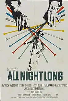 All Night Long is a 1962 British neo noir drama film directed by Basil Dearden, and starring Patrick McGoohan, Marti Stevens, Paul Harris, Keith Michell, Richard Attenborough and Betsy Blair. The story, by Nel King and Paul Jarrico, writing under the name Peter Achilles, is an updated version of William Shakespeare's Othello, set in the London jazz scene of the 1960s. The action takes place in a single evening, during an anniversary party. The black-and-white film features performances by several prominent British jazz musicians – among them Tubby Hayes and John Dankworth – as well as the Americans Dave Brubeck and Charles Mingus, who were in the UK in 1961 when filming took place and were recruited to participate.[1]