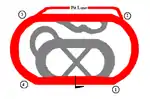 The track featured a pit lane that was uncharacteristic when compared to larger ovals for the weekly events. The pit lane was located on the outside of the course on the opposite side of the oval from the start finish line. However, during Grand National West races, the pit lane was moved to the 1/4 mile oval so as to be inside the larger oval, as is customary for most oval tracks, since live pit stops are used during the higher-level NASCAR-sanctioned race.