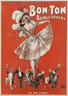 Burlesque in the United States is believed to have begun in New York with the arrival from England of Lydia Thompson's burlesque troupe, "The British Blondes".[11][12][13][14] It was the most popular entertainment in New York during the 1868–1869 theatrical season: "The eccentricities of pantomime and burlesque – with their curious combination of comedy, parody, satire, improvisation, song and dance, variety acts, cross-dressing, extravagant stage effects, risqué jokes and saucy costumes – while familiar enough to British audiences, took New York by storm."[15] Unfortunately, “the female audiences for burlesque did not last for long. In the summer of 1869 a wave of ‘anti-burlesque hysteria’ in the New York press frightened away the middle-class audiences ... and sent the Thompson troupe prematurely packing for a national tour”.[16] After this untimely closure, backlash against burlesque continued to grow. Thompson's shows were described as a “disgraceful spectacle of padded legs jiggling and wriggling in the insensate follies and indecencies of the hour”.[17] The New York Times consistently expressed its disgust of burlesque, even headlining an article with the plea “Exit British Burlesque”.[16]