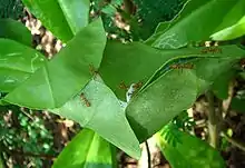 Weaver ant (Oecophylla spp.) workers build nests in trees by attaching leaves together, first pulling them together with bridges of workers and then inducing their larvae to produce silk as they are moved along the leaf edges. Similar forms of nest construction are seen in some species of Polyrhachis.[112]