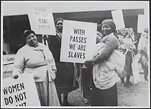 The government tightened pass laws compelling blacks to carry identity documents, to prevent the immigration of blacks from other countries. To reside in a city, blacks had to be in employment there. Until 1956 women were for the most part excluded from these pass requirements, as attempts to introduce pass laws for women were met with fierce resistance.[68]