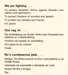 - ↑ Roherty, James Michael (1992). State security in South Africa: civil-military relations under P.W. Botha. M.E. Sharpe. p. 23. ISBN 978-0-87332-877-7.