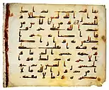 Written in the territory of modern Iraq in the Kufic script. Now kept in the Hast Imam library, in Tashkent, Uzbekistan.[42][43] Its verse endings are marked by small panels of diagonals lines; the tenth verse is marked with a square medallion illuminated in blue, green, red and manganese with a stellar design.[44]