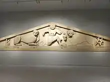 The names of many famous sculptors are known from the Late Classical period (400–323 BC), including Timotheos, Praxiteles, Leochares and Skopas, but their works are known mainly from Roman copies.[1] Little architectural sculpture of the period remains intact. The Temple of Asclepius at Epidauros had sculpture by Timotheos working with the architect Theodotos. Fragments of the eastern pediment survive, showing the Sack of Troy. The scene appears to have filled the space with figures carefully arranged to fit the slope and shape available, as with the earlier east pediment of the Temple of Zeus at Olympus. But the figures are more violent in action, the central space taken up, not with a commanding God, but with the dynamic figure of Neoptolemos as he seizes the aged king Priam and stabs him. The remaining fragments give the impression of a range of human emotions, fear, horror, cruelty and lust for conquest.[47] The acroteria were sculptured by Timotheus, except for that at the centre of the east pediment which is the work of the architect. The palmate acroteria have been replaced here with small figures, the eastern pediment being surmounted by a winged Nike, poised against the wind.[47]
