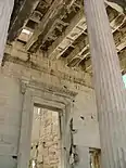 Door and window openings were spanned with a lintel, which in a stone building limited the possible width of the opening. The distance between columns was similarly affected by the nature of the lintel, columns on the exterior of buildings and carrying stone lintels being closer together than those on the interior, which carried wooden lintels.[28][29] Door and window openings narrowed towards the top.[29] Temples were constructed without windows, the light to the naos entering through the door. It has been suggested that some temples were lit from openings in the roof.[28] A door of the Ionic Order at the Erechtheion (17 feet high and 7.5 feet wide at the top) retains many of its features intact, including mouldings, and an entablature supported on console brackets. (See Architectural Decoration, below)[29][30][31]
