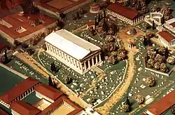 Above: Modern model of ancient Olympia with the Temple of Zeus at the centre