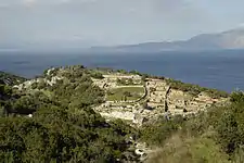 The construction of many houses employed walls of sun-dried clay bricks or wooden framework filled with fibrous material such as straw or seaweed covered with clay or plaster, on a base of stone which protected the more vulnerable elements from damp.[5] The roofs were probably of thatch with eaves which overhung the permeable walls. Many larger houses, such as those at Delos, were built of stone and plastered. The roofing material for the substantial house was tile. Houses of the wealthy had mosaic floors and demonstrated the Classical style.