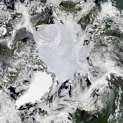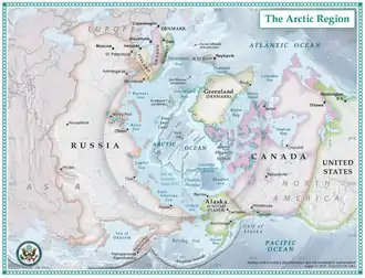 In addition, it is believed that the Arctic seabed may contain substantial oil fields which may become accessible if the ice covering them melts.[56] These factors have led to recent international debates as to which nations can claim sovereignty or ownership over the waters of the Arctic.[57][58][59][60]