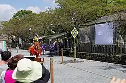 On the morning of the 25th of September, the farmers and Guji San gather at Aso shrine where they conduct the necessary rituals. Around midday, several tribute events are held on the shrine's 130m long sacred walking path.[22] The main event is the Yabusame, which is Japanese archery (弓道, Kyūdō) performed on horseback. This event was initially performed by the men in the village, however these days, it is performed entirely by the equestrian club of the local Aso Chuo High School.[21] The students of the club dress in clothing similar to the ones worn by the former Samurai family of Aso. The archers ride up and down the grounds trying their hand at sending an arrow into the center of the target. The event is not competition and is done solely for the entertainment of the Gods and villagers. Sumo matches are also held with members of the surrounding village's sumo club participating in the event.