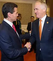 In 2016, both nations celebrated 50 years of diplomatic relations.[4] In August of that same year, Australian Governor-General Peter Cosgrove paid a visit to Mexico and met with Mexican President Enrique Peña Nieto to celebrate the 50th anniversary of diplomatic relations between both nations.[5]