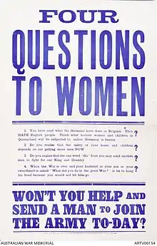 The role of Australian women in World War I was focused mainly upon their involvement in the provision of nursing services.[1] Australian women also played a significant role on the homefront, where they filled jobs made vacant by men joining the armed forces. Women also undertook fundraising and recruiting activities as well as organising comfort packages for soldiers serving overseas. Around the issue of conscription, women were involved in campaigning on both sides of the debate,[2] while they were also equally involved in the New South Wales strike in 1917. Nevertheless, despite this involvement, women have never occupied a central position in the Australian version of the ANZAC myth, although since the 1970s their role has been examined in more detail as a result of the emergence of feminist historiography, and specialist histories such as the history of nursing.