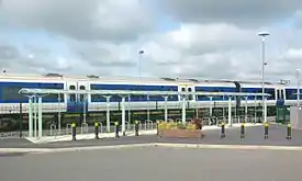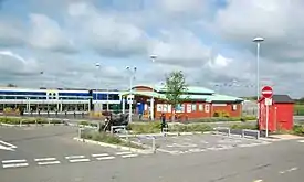 ![]() Aylesbury Vale Parkway station, showing the taxi rank (left), cycle shelter (centre) and booking hall (right)  | |