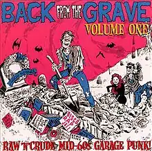 Back from the Grave, Volume 1 (CD) is the first installment in the Back from the Grave compact disc-exclusive series of garage rock compilations put together by Tim Warren of Crypt Records. It was released on August 23, 1996.[1][2][3] Its track listing differs from that of the LP version, which is part of the Back From the Grave LP-edition series, also on Crypt. In keeping with all of the entries in the series, and as indicated in the subheading which reads "Raw 'n' Crude Mid-60s Garage Punk!," this collection consists of songs which display the rawer and more aggressive side of the genre and are often characterized by the use of fuzztone-distorted guitars and rough vocals.[1][4] The set generally excludes psychedelic, folk rock, and pop-influenced material in favor of basic primitive rock and roll.[4] The packaging features a booklet containing well-researched liner notes written by Tim Warren which conveys basic information about each song and group, such as origin, recording date, and biographical sketches, usually written in a conversational style that includes occasional slang, anecdotes, humorous asides.[4] The liner notes are noticeably opinionated, sometimes engaging in tongue-in-cheek insults directed at other genres of music.[4] The booklet also includes photographs of the bands, and the front cover features a highly satirical cartoon by Mort Todd depicting a revivified "rock and roll" zombie who, along with his macabre cohorts, has just emerged from the grave to "bury" all specimens of supposedly "heretical" pop and progressive music which have come to prominence over the years, such as disco music and MTV.[5][4]