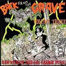 Back from the Grave, Volume 3 (CD), is the third installment in the Back from the Grave compact disc-edition series of garage rock compilations assembled by Tim Warren of Crypt Records.[1][2][3][4] It was released on August 23 1996. Its track listing differs from that of the LP version, which is part of the Back From the Grave LP-edition series, also on Crypt. In keeping with all of the entries in the series, and as indicated in the subheading which reads "Raw 'n' Crude Mid-60s Garage Punk!," this collection consists of many songs which display the rawer and more aggressive side of the genre and are often characterized by the use of fuzztone-distorted guitars and rough vocals.[1][5][3] Accordingly, the set generally excludes psychedelic, folk rock, and pop-influenced material in favor of basic primitive rock and roll.[1][5][3] The packaging features a booklet containing well-researched liner notes written by Tim Warren which conveys basic information about each song and group, such as origin, recording date, and biographical sketches, usually written in a conversational style that includes occasional slang, anecdotes, humorous asides.[5] The liner notes are noticeably opinionated, sometimes engaging in tongue-in-cheek insults directed at other genres of music.[5][3] The booklet also includes photographs of the bands, and the front cover features a highly satirical cartoon by Mort Todd depicting revivified "rock and roll" zombies who have just emerged from the grave to "drop in a pit" all adherents of supposedly "heretical" pop and progressive music which have come to prominence over the years.[5]