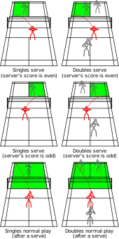 In singles, the server stands in their right service court when their score is even, and in their left service court when their score is odd.