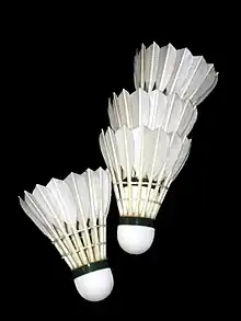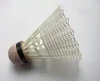A shuttlecock (often abbreviated to shuttle; also called a birdie) is a high-drag projectile, with an open conical shape: the cone is formed from sixteen overlapping feathers embedded into a rounded cork base. The cork is covered with thin leather or synthetic material. Synthetic shuttles are often used by recreational players to reduce their costs as feathered shuttles break easily. These nylon shuttles may be constructed with either natural cork or synthetic foam base and a plastic skirt.