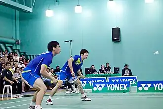 Korean players Lee Yong-dae and Ko Sung-hyun defend against a smash.