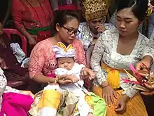 A newborn baby is believed to represent the soul of an ancestor and is regarded as a god for the first 42 days of its life. However, the mother is regarded as impure and is not allowed to participate in any religious activities during this period. A baby must not touch the impure ground until it is 105 days old, halfway to the celebration of its first birthday according to the 210-day Balinese Pawukon calendar. Once the child reaches puberty, the six upper canine teeth are filed until they are even.[37][38]