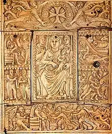 Among the most significant manuscripts of the Matenadaran are the Lazarian Gospel (9th century), the Echmiadzin Gospel (10th century) and the Mughni Gospel (11th century).[88] The first, so called because it was brought from the Lazarian Institute, is from 887 and is one of the Matenadaran's oldest complete volumes. The Echmiadzin Gospel, dated 989, has a 6th-century, probably Byzantine, carved ivory cover.[29][88] The Cilician illuminated manuscripts by Toros Roslin (13th century) and Sargis Pitsak (14th century), two prominent masters, are also held with high esteem.[29]