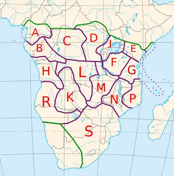 The approximate locations of the sixteen Guthrie Bantu zones, including the addition of a zone J around the Great Lakes. The Jarawan languages are spoken in Nigeria.